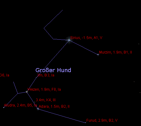 Der große Hund (Canis Major) ist von Dezember bis April zu sehen und liegt südlich des Orion. Die drei Sterne des Oriongürtels zeigen direkt auf Sirius, den hellsten Stern am Nachthimmel, der auch den südlichsten Eckpunkt des Wintersechsecks markiert. Von Mitteleuropa aus steht der Große Hund im Winter tief über dem Südhorizont. Durch den westlichen Teil des Sternbildes zieht sich das sternreiche Band der Milchstraße, daher können im Großen Hund einige interessante Sternhaufen beobachtet werden. Bereits in Helsinki oder Stockholm ist der südlichste Teil des Großen Hundes nicht mehr sichtbar. Zusammen mit Prokyon, Castor und Pollux, Capella, Aldebaran und Rigel bildet er das Wintersechseck.