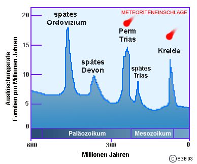 Das Ende des  Paläozoikums (Perm)  ist durch ein extremes Massensterben gekennzeichnet, bei dem (geschätzt) 99% aller Arten ausstarben. Die Ursache ist noch spekulativ. Vielleicht haben Meteoriteneinschläge oder sibirische Vulkanausbrüche eine Klimaänderung herbeigeführt.