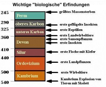 Mit dem Paläozoikum oder Erdaltertum beginnt ein neues und biologisch bedeutsames Zeitalter der Erdgeschichte. Man unterteilt diese Zeit in 6 Abschnitte: