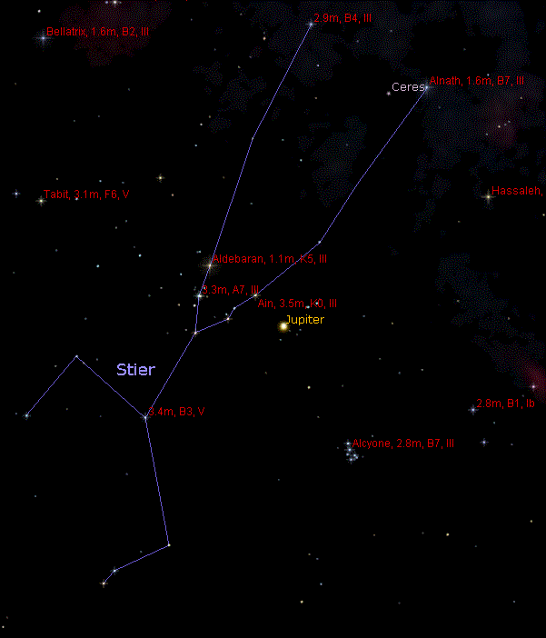 Der Stier ist abends von November bis April sichtbar, morgens von August bis Dezember. Er steht am Himmel nördlich des auffälligen Orion, der ihn der Mythologie nach bezwungen hat.